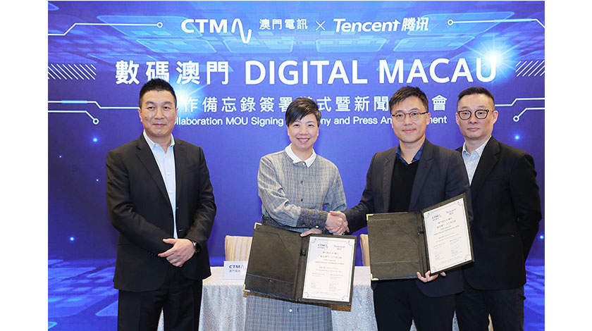 澳門電訊和騰訊於12月18日假澳門美獅美高梅酒店舉行「數碼澳門」合作備忘錄簽署儀式,儀式在澳門電訊行政總裁潘福禧及騰訊國際業務副總裁楊寶樹見證下,由澳門電訊商務副總裁湛寶儀和騰訊國際業務部總經理譚樂文共同主持。