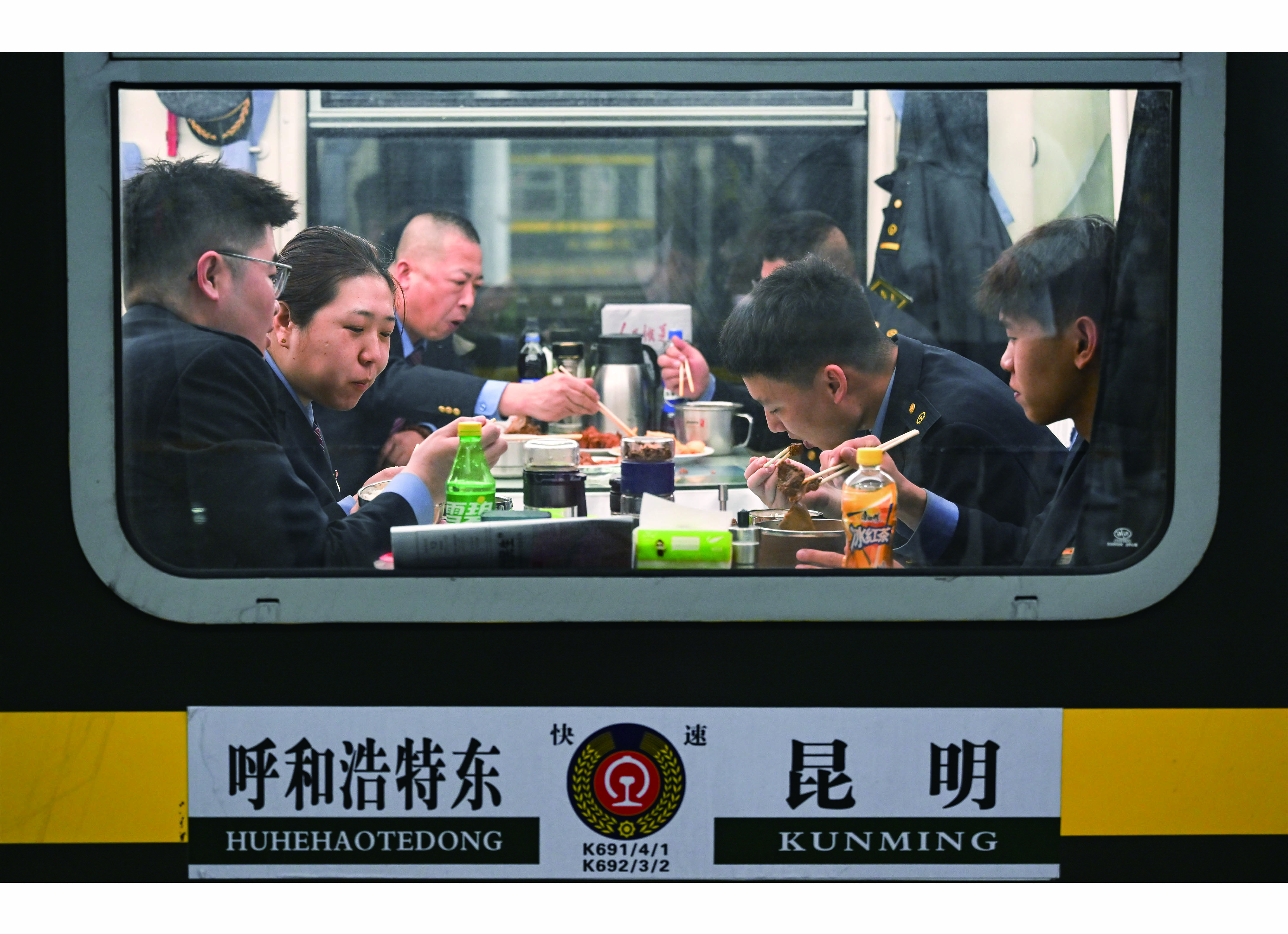 2月15日,工作間隙,列車員在餐車用餐。除夕當天,K691/694次列車歷經近36小時、跨越近3000公里的距離,從「青城」呼和浩特抵達了終點「春城」昆明。該列車由中國鐵路呼和浩特局集團有限公司包頭客運段擔當值乘。針對春運期間客流量大、老幼旅客增多等情況,列車乘務員積極引導旅客有序上下車、協助搬運大件行李。