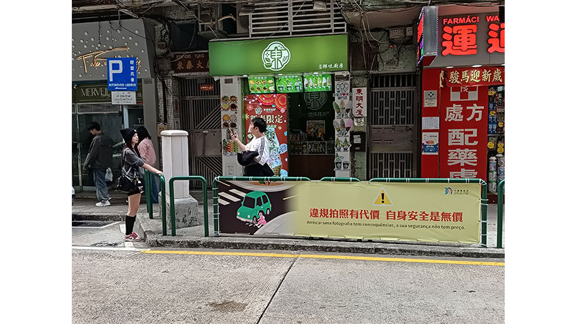 【圖片新聞】東望洋新街向新葡京酒店方向近年成為旅客打卡熱點,不分日夜人群聚集,有人為攞得靚景,不惜『以身犯險』走出馬路拍照,險象環生,近日已見當局在相關打卡熱點掛上『警告』橫額,勸喻拍照要顧自身安全。