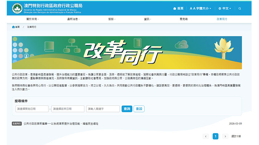 【特訊】為進一步提高公共行政改革的透明度,擴大社會參與度,行政公職局網站(www.safp.gov.mo)由9日起增設“改革同行”欄目,旨在及時向公眾及公務員隊伍傳遞改革資訊,凝聚社會合力,共同推動澳門特區治理體系和治理能力現代化。