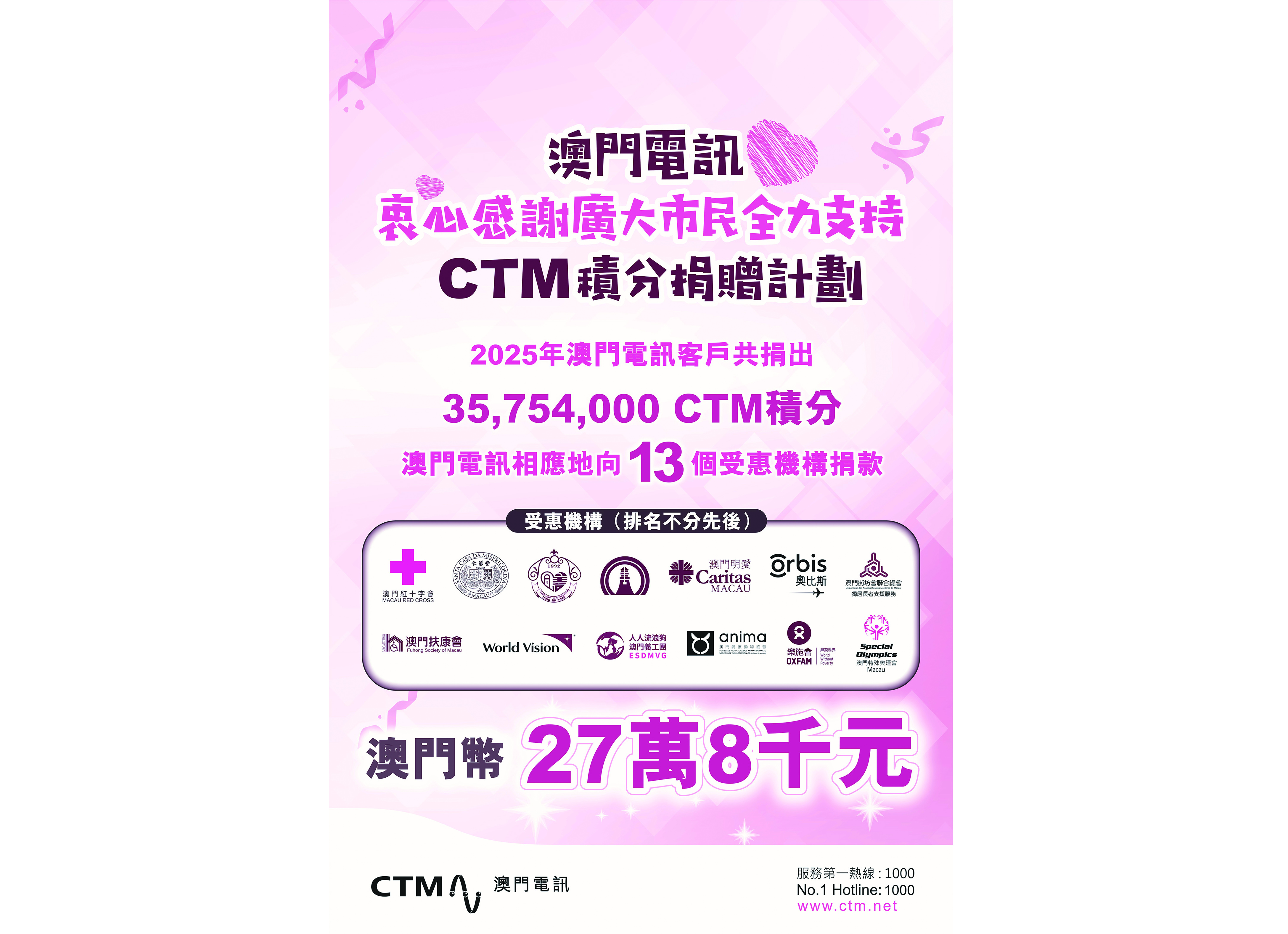澳門電訊透過「積分捐贈計劃」,鼓勵客戶共同參與慈善活動,2025年,客戶共捐出35754000積分,而澳門電訊相應合共捐出澳門幣27萬8千圓,以支持十三家機構開展相關的社會公益工作,包括澳門同善堂、澳門日報讀者公益基金會、澳門仁慈堂、澳門明愛、澳門扶康會、澳門紅十字會、街坊總會獨居長者支援服務、澳門特殊奧運會、澳門奧比斯、澳門樂施會、世界宣明會、澳門愛護動物協會、人人流浪狗澳門義工團。