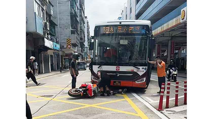 【本報訊】巴素打爾古街與沙欄仔街交界昨日下午發生交通意外,一輛公共巴士與一輛電單車發生碰撞,電單車男司機手腳受傷被困巴士車頭底部,由據報消防員救出送院治理。事故原因巴士沒有讓先引致。