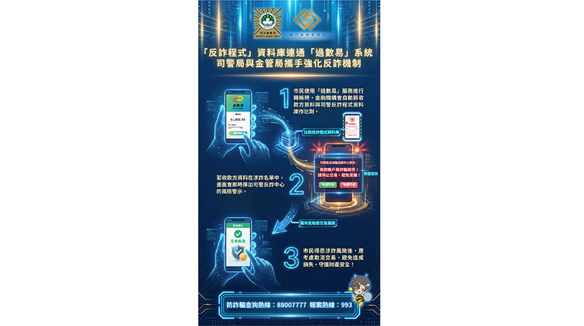 【特訊】為進一步加強防範電訊網絡詐騙,司法警察局與澳門金融管理局透過“反詐騙聯動機制”合作優化“詐騙帳戶預警”措施,正式連通“反詐程式”資料庫和“過數易”快速支付系統,並協調金融機構在“過數易”加入識別可疑收款帳戶的功能,讓市民在進行“過數易”跨行轉帳操作時,可即時獲取倘有的風險提示,以及時識別潛在詐騙風險。