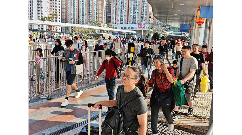 昨日接近中午時段,關閘口岸入境大堂及廣場的人流不斷,巴士總站及的士站有候車人龍,發財巴候客區也見人頭湧湧,有警員及工作人員在場協助疏導人流,秩序良好。