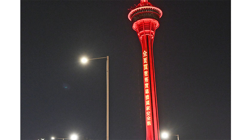 及後,岑浩輝一行移步到中葡綜合體正門外,主持澳門、橫琴、珠海三地聯動點亮城市地標宣傳國家安全資訊的亮燈儀式,並觀賞國安主題無人機匯演。