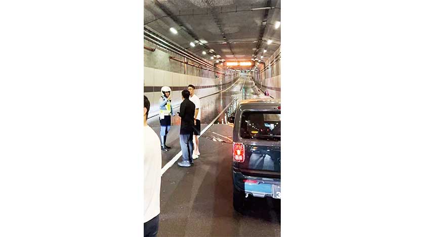 事發於昨晚八時許,澳門大學河底隧道往澳大方向中段,隧道壁有消防水管突然爆裂,大量的水洶湧而出,流向最低點,至最低點一段車道積水越來越深,有駛至的車輛及時通過,後來的車輛則未敢通過,多輛車因此堵塞在隧道內。