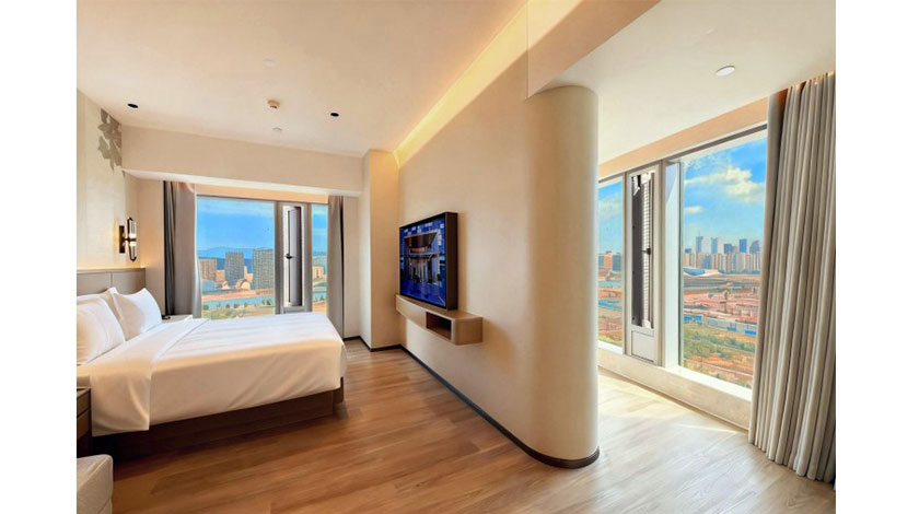 酒店擁有233間現代簡約客房,將山、河、城景盡收眼底。室內配備全屋智能控制系統與精選高端床墊,在寬敞靜謐的空間中,為每一位觀演或參賽的賓客,構築煥發活力的深度睡眠保障。其最大亮點在於專為音樂節、體育賽事及粉絲群體打造的沉浸式應援空間,包括專屬外牆燈光秀及粉絲互動大屏,令其成為大灣區迄今首間真正意義上的「賽演友好型酒店」。
