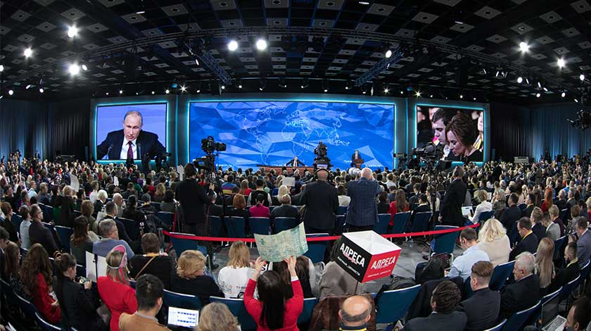 12月20日,在俄羅斯首都莫斯科,俄羅斯總統普京舉行年度記者會。(新華社記者 白雪騏 攝)