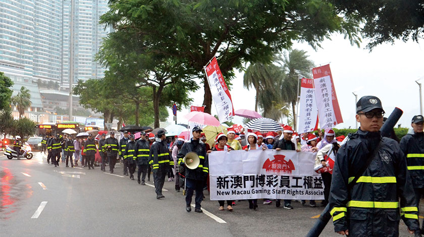 【本報訊】昨午,新澳門博彩員工權益會及澳門司機權益會發起遊行,訴求之一是立法禁止輸入外地莊荷及司機。兩團體報稱約二百人參加,警方聲稱高峰時有九十人。