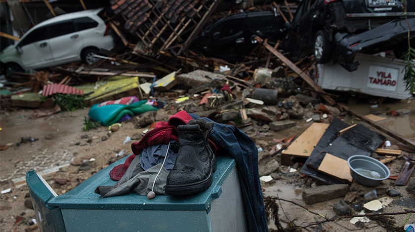 12月23日,在印度尼西亞萬丹省板底蘭,一輛挖掘機清理路面。印度尼西亞抗災署23日說,印尼西部巽他海峽海嘯死亡人數已經上升到222人。印尼西部巽他海峽22日晚發生海嘯。海嘯發生時當地沒有監測到地震活動,初步懷疑海嘯是由喀拉喀托火山噴發引發海底岩層滑坡和月圓引發漲潮共同所致。(新華社)