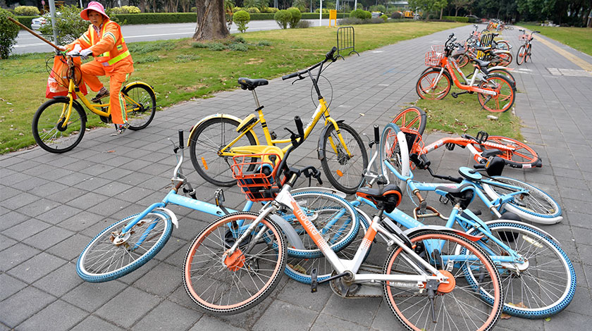 近日,有媒體報道,OFO線上線下排隊退押金,生存空間令人堪憂。初步統計,目前中國內地每天共享單車的使用量在1000萬人次以上,圖為深圳紅荔西路。(香港中通社)