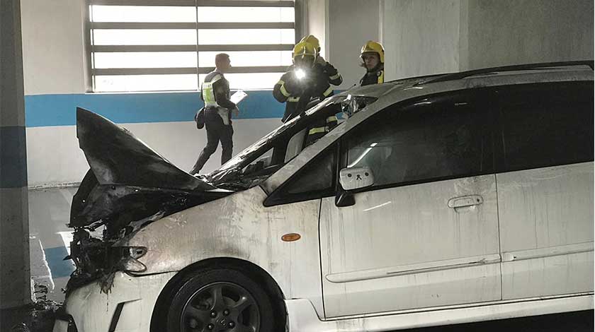 昨日上午十一時許,消防接報河邊新街凱泉灣停車場三樓有汽車著火。消防員到場拖喉灌救,火舌迅速被撲滅,車頭焚毀,車頭擋風玻璃穿破,車廂熏黑。現場未有波及其它車輛,沒有人受傷。