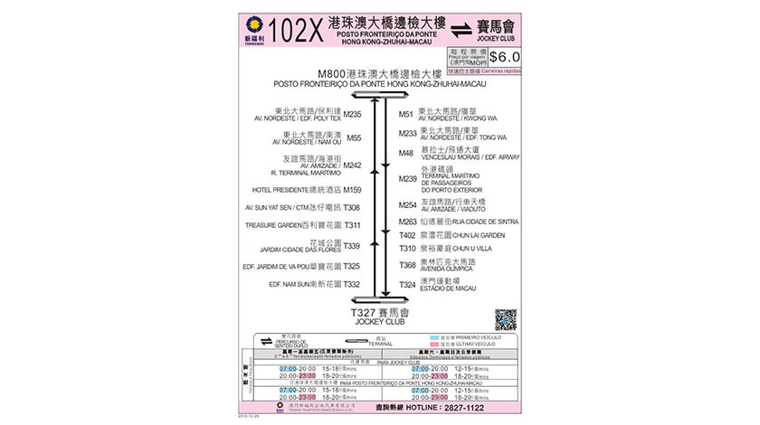 【特訊】交通事務局經檢視車輛的營運及市民的乘車習慣後,12月29日(周六)首班車起,102X路線於“港珠澳大橋邊檢大樓”站開出,原線至“慕拉士/飛通大廈”站後,新增停靠“外港碼頭”站再按原線行駛,以便利旅客搭乘。