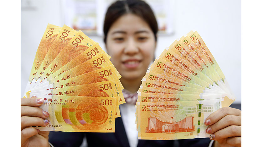 B 12月28日,山西太原一銀行,工作人員正在展示人民幣發行70周年紀念鈔。當日,由中國人民銀行發行的人民幣發行70周年紀念鈔與改革開放40周年紀念幣同時開始公開兌換,大量民眾在銀行排隊兌換。 (中新社圖片/ 張雲 攝)