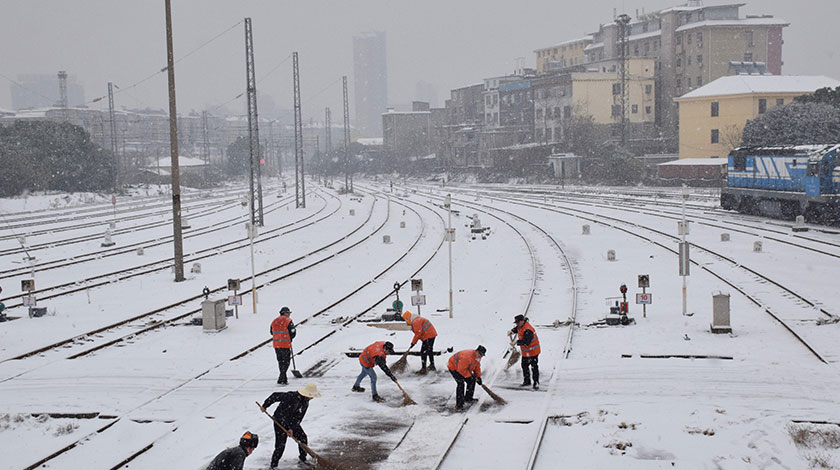 12月30日,南昌車輛段九江運用車間對站場線路進行掃冰除雪作業,確保列車運行安全。當日,大雪如期而至,該省境內15條高速公路通行受影響,南昌昌北國際機場暫停航班起降。 (中新社圖片/ 許建軍 攝)