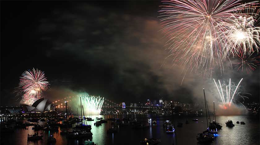 當地時間12月31日晚9時,全長8分鐘的悉尼跨年慶典家庭煙花表演(New Year’s Eve family fireworks)用鮮艶的色彩為悉尼海港揮灑跳躍奔騰的花火,拉開跨年慶典煙花匯演序幕。圖為家庭煙花表演現場。 (中新社圖片/ 姜長庚 攝)