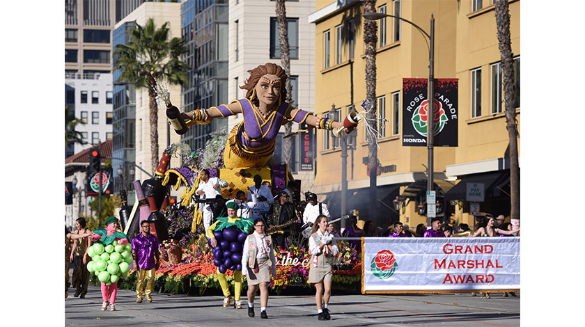 當地時間2019年1月1日上午8時許,第130屆美國玫瑰花車遊行在加利福尼亞州南部歷史文化名城帕薩迪納市舉行。今年玫瑰花車遊行主題是“The Melody of Life(生命的旋律)”。圖為花車遊行現場。 (中新社圖片/ 張朔 攝)