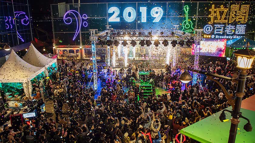 「澳門百老匯」美食街——歡樂坊舉辦了一系列倒數活動,借不間斷熱鬧表演盡情狂歡共赴2019!派對自18年12月31日夜晚9時起,由百老匯特色黃包車歌手打頭陣,而主場樂隊Bobo & Gang及本地舞蹈團體MISDA和L.D.G.亦緊隨連番登場,將派對氣氛燙得火熱。當時針踏正午夜一刻,全場一起歡呼舉杯,高漲的情緒達至頂峰,觥籌交錯中迎接充滿希望和夢想的2019年。