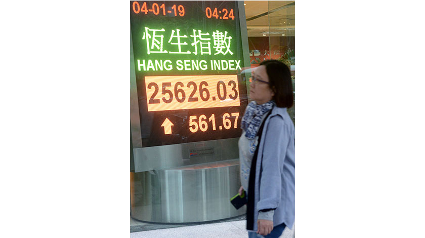 【香港中通社1月4日電】 港股2019年開局兩日累插3%後,4日先低後高,收市強彈逾2%。恆指以全日高位收市,報25626點,升561點,總成交804.72億港元。
