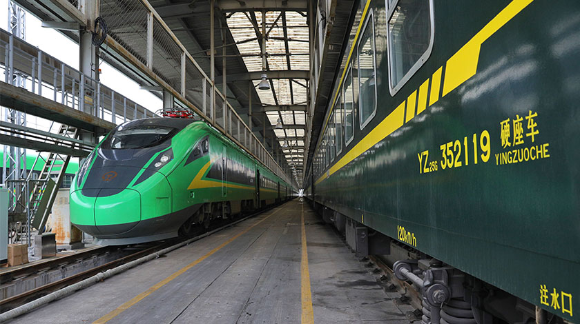 1月6日,『復興號』家族新成員『綠巨人』在上海車輛段進行調試工作,即將在春運期間投入運營。該型動車組塗裝為翠綠色,與普通綠皮車相比色彩更明快。(中新社圖片/ 張亨偉 攝)