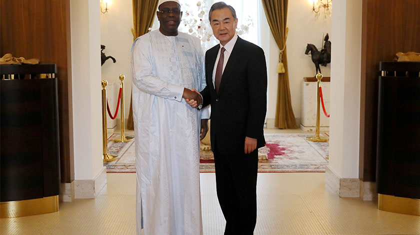 1月6日,塞內加爾總統薩勒(左)在達喀爾總統府會見中國國務委員兼外交部長王毅。 (新華社記者王騰攝)