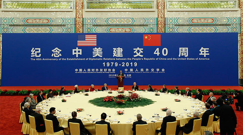 1月10日,紀念中美建交40周年招待會在北京人民大會堂舉行,中國國家副主席王岐山出席並致辭。美國駐華大使布蘭斯塔德、中美各界人士300餘人出席招待會。 (中新社圖片/ 杜洋 攝)