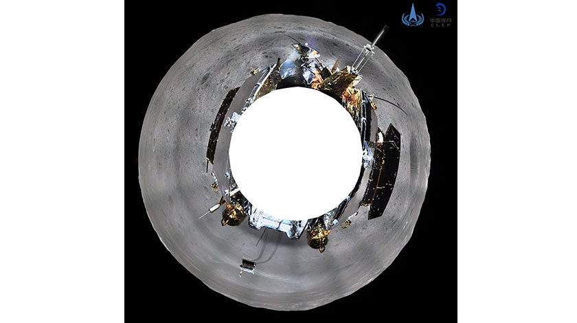 中國國家航天局1月11日發佈消息說,截至北京時間當日8時,嫦娥四號著陸器、玉兔二號巡視器(月球車)和『鵲橋』中繼星狀態穩定,各項工作按計劃實施。嫦娥四號著陸器上配置的地形地貌相機在月球背面完成了360度環拍,科研人員根據『鵲橋』中繼星傳回的數據,製作出清晰的環拍影像圖。圖為嫦娥四號著陸器地形地貌相機環拍全景圖(方位投影)。(中新社圖片/ 中國國家航天局 攝)