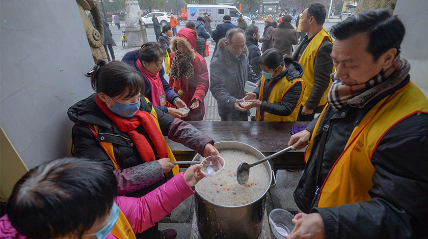 1月13日,義工為市民贈粥。當日,正值臘八節,長沙古開福寺愛心義工熬製好臘八粥,免費向市民提供,寓意大家來年都有個好兆頭。(中新社圖片/ 楊華峰 攝)