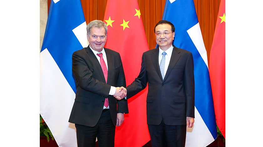 1月15日,中國國務院總理李克強在北京人民大會堂會見來華進行國事訪問的芬蘭總統尼尼斯托。(中新社圖片/ 劉震 攝)