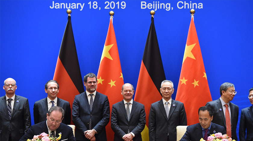 1月18日,中國國務院副總理劉鶴在北京與德國副總理兼財長蕭爾茨共同主持第二次中德高級別財金對話。對話期間,雙方簽署了《中德央行合作諒解備忘錄》、《中德銀行業監管合作意向信》和《中德證券期貨監管合作諒解備忘錄》三份合作文件。(中新社圖片/ 侯宇 攝)