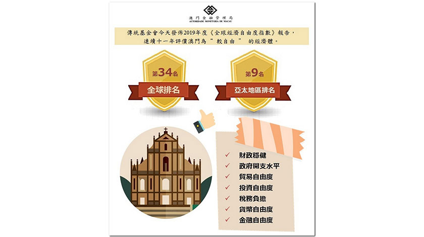 【特訊】傳統基金會昨天發佈2019年度《全球經濟自由度指數》報告,連續十一年評價澳門為「較自由」的經濟體。澳門的總體經濟自由度評分為71.0,較2018年度的70.9為高,並明顯高於世界及區內的平均水平,在全球180個經濟體中排名第34位。在亞太地區43個經濟體中,澳門排名第9,僅次於香港、新加坡、新西蘭、澳洲、台灣地區、馬來西亞、韓國及日本。