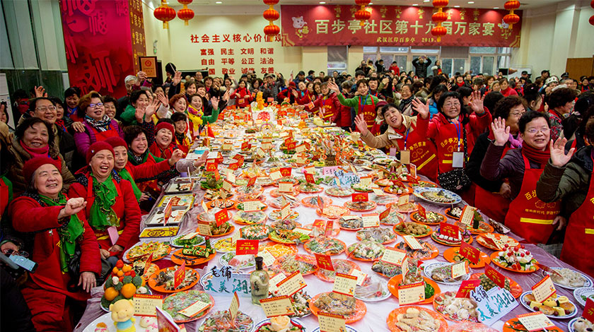 1月29日正值中國南方農曆小年,武漢百步亭社區萬家宴熱鬧開席,社區居民端出13000多道自製菜品,4萬多個家庭歡聚一堂共品佳肴。(中新社圖片/ 張暢 攝)