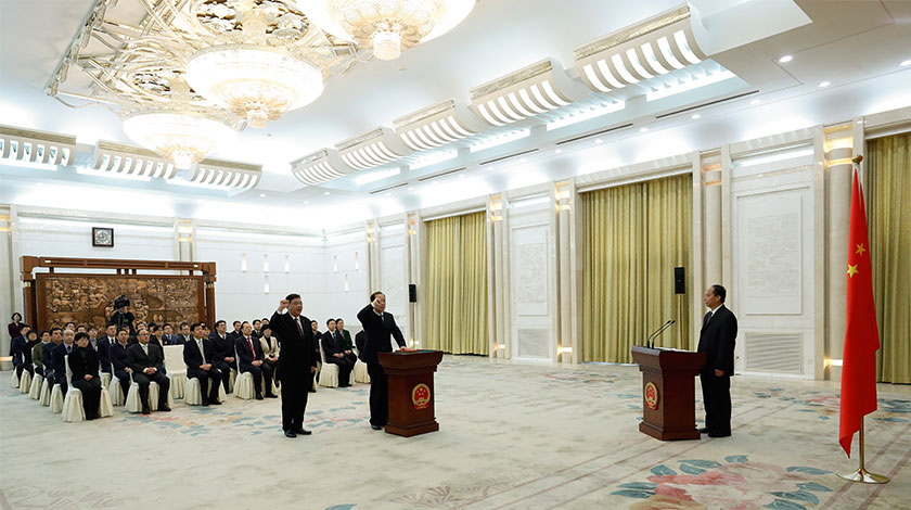 1月30日,十三屆全國人大常委會在人民大會堂舉行憲法宣誓儀式。全國人大常委會副委員長吉炳軒主持並監誓。剛剛閉幕的十三屆全國人大常委會第八次會議任命李寧為全國人大常委會法制工作委員會副主任。根據憲法和全國人大常委會關於實行憲法宣誓制度的決定,上述人員依法進行憲法宣誓。(中新社圖片/ 杜洋 攝)