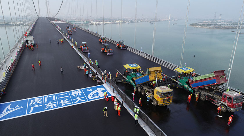 1月30日,粵港澳大灣區又一重要過江通道虎門二橋項目的兩座主橋鋼橋面環氧瀝青鋪裝工程完成,預計今年5月1日前通車。當天,虎門二橋大沙水道橋的橋面上機械轟鳴,兩台攤舖機緩緩駛離瀝青面,七台震蕩壓路機對該橋左幅環氧瀝青的上面層施工進行最後一道循環碾壓工序。 (中新社圖片/ 岳路建 攝)