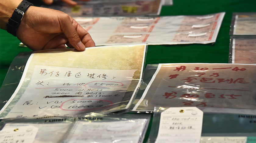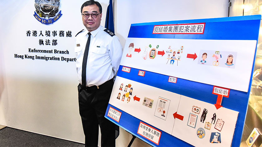 同年5月,入境處將這名55歲、且為香港永久性居民的集團首腦拘捕,並在其住處找到大量涉及從事虛假婚姻活動的有關文件,包括香港居民身份證副本、內地居民通行證副本、家庭傭工外國護照副本、結婚證書及租約等。