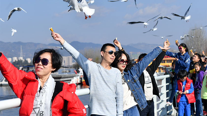 2月11日,遊客在昆明滇池與紅嘴鷗嬉戲。春節假期結束,但昆明『觀鷗遊』的熱度並未減少,不少遊客匯聚在昆明海埂大壩,與來此越冬的紅嘴鷗近距離接觸。 (中新社圖片/ 任東 攝)