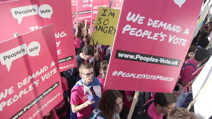 10月20日,67萬英國民眾匯集在倫敦議會廣場舉行示威遊行活動,呼籲對英國脫歐最終協議舉行全民投票。圖為示威遊行人群高舉標語牌,呼籲舉行『人民投票』。(中新社圖片/ 張平 攝)