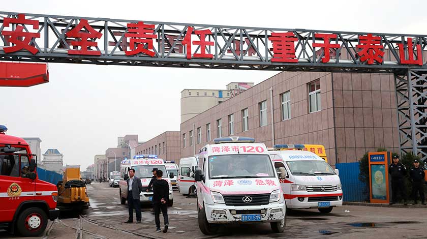 10月21日,山東龍鄆煤業有限公司院內外停放的救援車輛。10月20日23時,位於山東鄆城的龍鄆煤業有限公司1303洩水巷發生事故,造成約100米巷道出現不同程度破壞。該礦當班下井334人,險情發生後312人升井,22人被困井下。目前,已有2名受困者被救出,2人遇難,仍有18人被困,多方力量仍在現場進行緊張救援工作。(中新社圖片/ 梁犇 攝)
