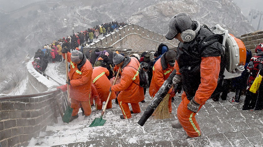 全國多地降雪2月14日,工作人員在北京八達嶺長城景區清掃積雪。當日,全國多地降雪。(新華社記者 王毓國 攝)
