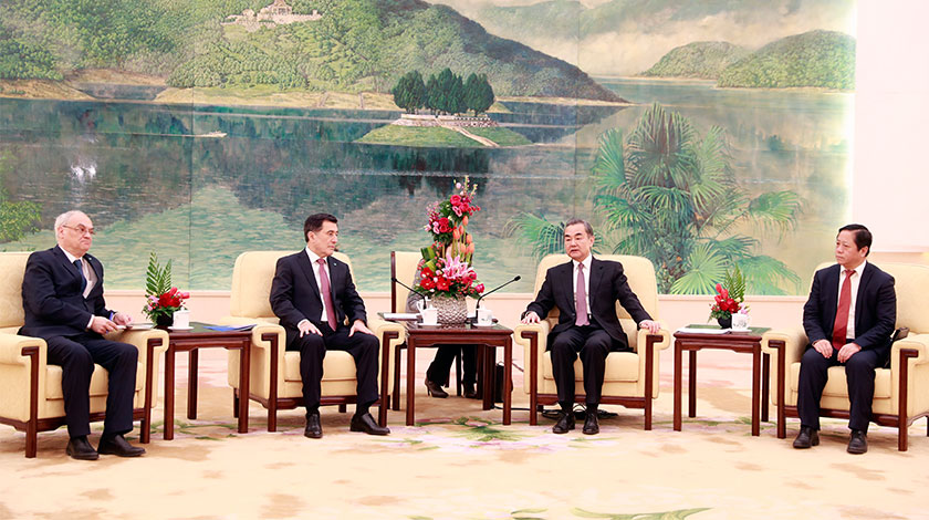 2月15日,國務委員兼外長王毅在北京會見上海合作組織新任秘書長諾羅夫。(中新社圖片/ 盛佳鵬 攝)