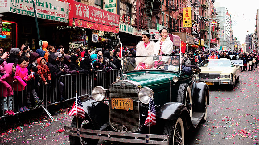 當地時間2月17日,紐約曼哈頓唐人街舉行第20屆紐約新春愛心花車大遊行慶祝中國春節。遊行由3萬名遊行隊員、200多個隊伍和80部大小花車構成,吸引各族裔民眾夾道觀賞。圖為美國華裔小姐競選佳麗在遊行花車上。(中新社圖片/ 廖攀 攝)