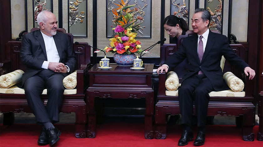 2月19日,中國國務委員兼外交部長王毅在北京會見陪同拉里賈尼議長訪華的伊朗外長扎裡夫。(中新社圖片/ 宋吉河 攝)