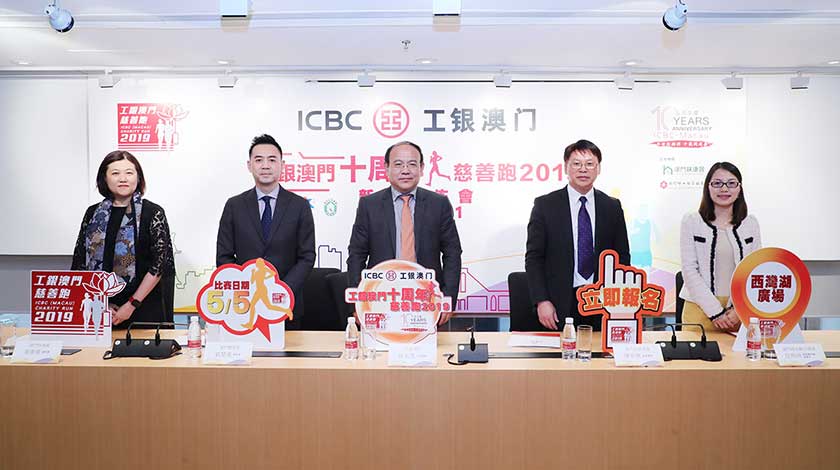 工銀澳門於2月21日假澳門皇朝廣場9樓工銀澳門演講廳舉行《工銀澳門十周年慈善跑2019》新聞發佈會,工銀澳門行政總裁徐克恩、澳門體育局副局長劉楚遠、澳門田徑總會副理事長陳步倩、澳門扶康會總幹事周惠儀、澳門婦女聯合總會副理事長兼秘書長庄玲玲出席。