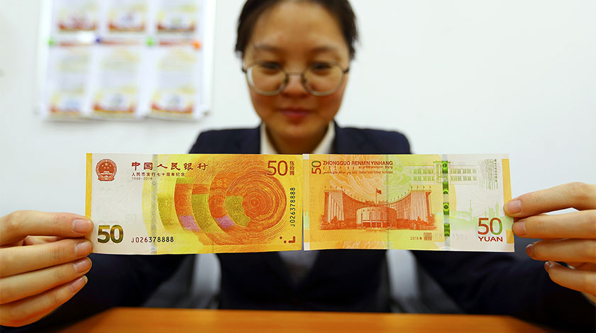 2月22日,山西太原一銀行外,民眾排隊等候兌換紀念鈔。當日,由中國人民銀行發行的人民幣發行70周年紀念鈔開始現場兌換。 (中新社圖片/ 張雲 攝)