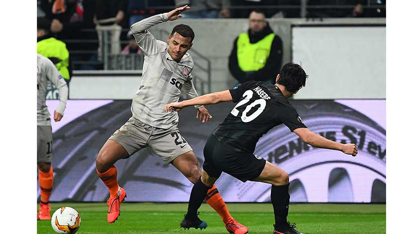 21日足球-歐羅巴聯賽:法蘭克福戰勝頓涅茨克礦工,在比賽中與法蘭克福隊球員長谷部誠拼搶(新華社)