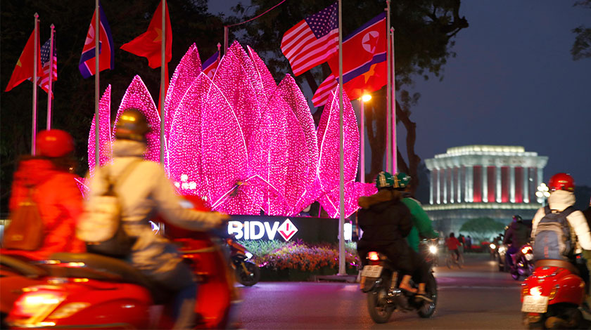 2月25日,越南首都河內街頭懸掛的越南、美國、朝鮮三國國旗。朝鮮最高領導人金正恩與美國總統特朗普27日至28日將在越南首都河內舉行第二次會晤,磋商如何進一步推動半島無核化進程以及改善朝美關係。(中新社圖片/ 富田 攝)