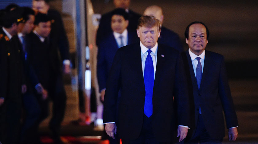 美國總統唐納德•特朗普(前線)於2019年2月26日抵達越南河內的一個機場。美國總統唐納德•特朗普週二晚抵達越南首都河內,會見朝鮮民主主義人民共和國最高領導人金正恩。(新華社/王申)