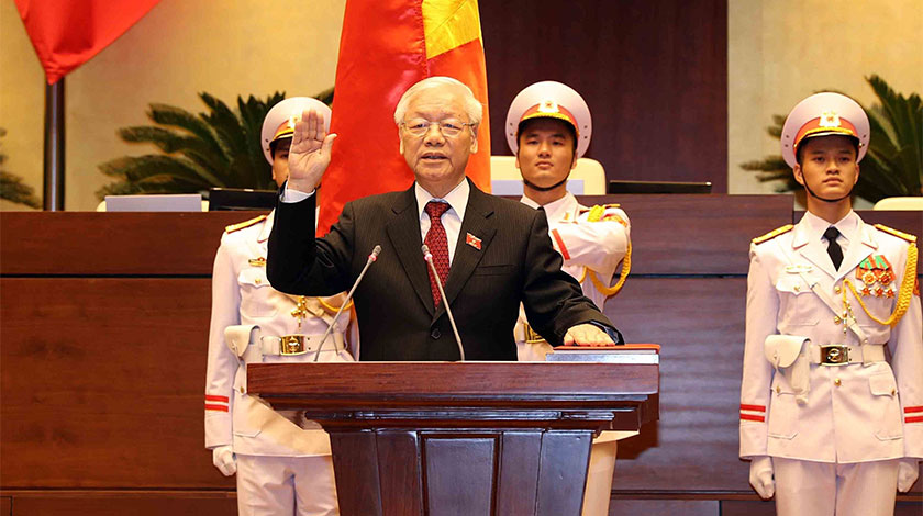 10月23日,在越南首都河內,新當選的越南國家主席阮富仲(前)宣誓就職。越南第十四屆國會第六次會議23日在首都河內投票選舉越共中央總書記阮富仲為A新一任越南國家主席,阮富仲隨後宣誓就職。 (新華社/越通社)