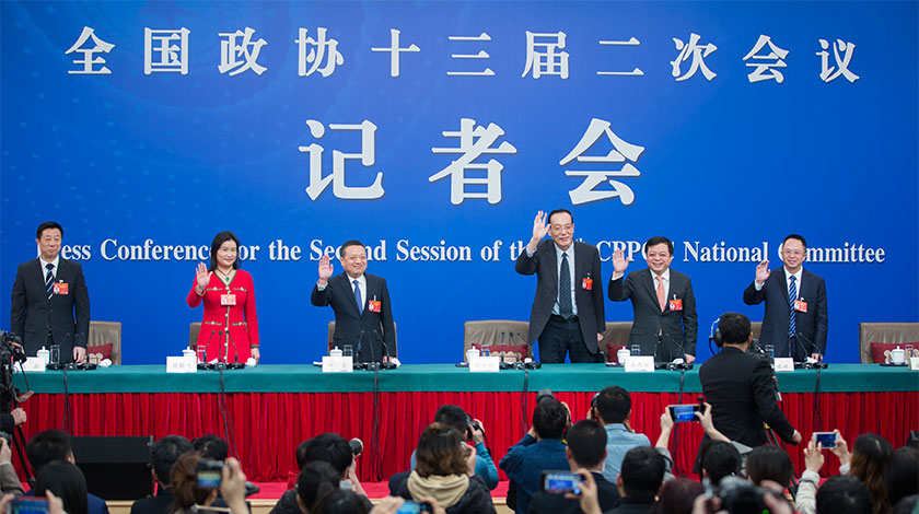 3月6日,全國政協十三屆二次會議新聞中心舉行記者會,邀請全國政協委員劉世錦(左四)、南存輝(右二)、葉青(左三)、周鴻禕(右一)、周群飛(左二)談優化營商環境、促進民營經濟高質量發展。 (中新社圖片/ 王駿 攝)