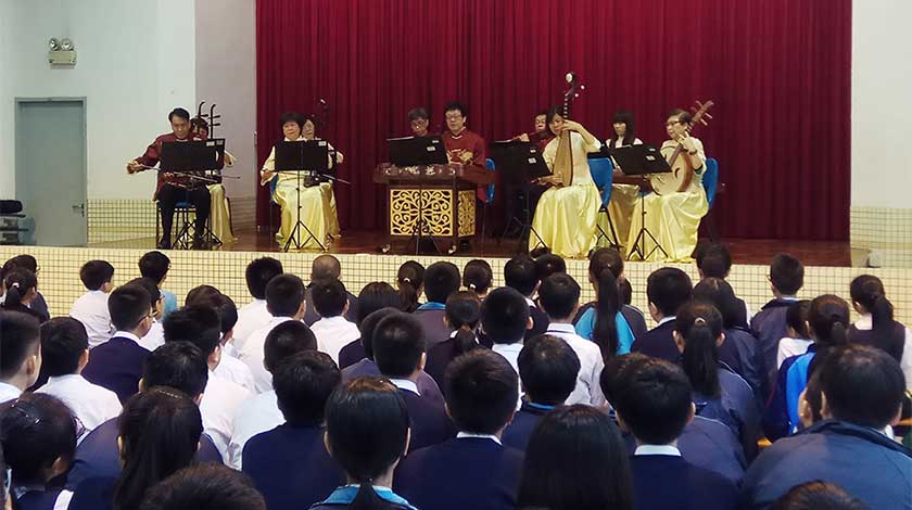 中國民族音樂文化歷史悠久,在漫長的歷史中,發展出一系列富有鮮明民族特色的樂器。各種樂器基本上分為吹、拉、彈、打四大類。團員向同學們介紹吹奏類,包括笛、簫、笙、嗩吶等,拉弦樂器分別有高胡、二胡、中胡、板胡、等,歷史雖然比其他民族樂器較短,但由於發音優美,表現力豐富,有很高的演奏技巧和藝術水準,拉絃樂器被廣泛使用於獨奏、重奏、合奏與伴奏。中國的彈撥樂器音色明亮、清脆,分橫式與豎式兩類,橫式: 箏、古琴、揚琴等,豎式:琵琶、阮、等。